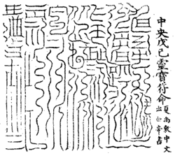 The canon itself is a mix of previous Daoist traditions, combining features from the Shangqing School and the Celestial Masters, along with other ancient texts and even some Buddhist ideas. The two most important texts of the canon besides the Wufujing are the Red Book of Five Writings (Chi shu wupian) and the Scripture of Upper Chapters on Limitless Salvation (Wuliang Duren Shangpin).[27] According to Lu Xiujing, who edited the Lingbao Canon, there were a total of 34 texts in the canon, of which three have been lost.[4]
