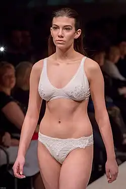 Lingerie (UK: /ˈlæ̃ʒəri, ˈlɒn-/, US: /ˌlɒnʒəˈreɪ, ˌlænʒəˈriː/,[1] French: [lɛ̃ʒʁi] ⓘ) is a category of primarily women's clothing including undergarments (mainly brassieres), sleepwear, and lightweight robes. The choice of the word is often motivated by an intention to imply that the garments are alluring, fashionable, or both. In a 2015 US survey, 75% of women reported having worn "sexy lingerie" in their lifetime.[2]