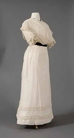 Lingerie dresses were worn by various classes of women in North America and Europe in the decades of the 1900s up to the 1920.[8][7] They were often worn at outdoor activities and were touted as being appropriate for warm weather.[1][2] They were also easier to wash than other kinds of dresses.[7] In addition, they were praised for their simplicity which also implied that they were less costly than other types of dresses.[9]