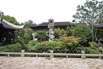 The 23,310 m2 garden is divided into four distinctly themed sections; East, Central, West, and North.[4] The Central area is the oldest part of the garden. Buildings, the primary feature of any Chinese garden, occupy one third of the total area. A unique feature of this garden is the 700m of covered walkway which connects them.[4] The built elements of the garden are grouped by section.[5] The ensemble of structures in the central garden encircles a pond and grotto main feature. The grotto is constructed of yellowstone granite and was created by the noted artist Zhou Binzhong. The eastern section of the garden is arrayed around the cloud-capped peak stone. A central courtyard is ringed by buildings. Behind the Old Hermit Scholars' House is the Small Court of Stone Forest, a collection of Scholar stones and connected minor courtyards. The western section is mostly natural, containing only a few pavilions, a large artificial hill, and a Penzai garden.