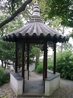 The name comes from a verse by Liu Yuxi, "the bright moon passes the pavilion".[2] A freestanding hexagonal pavilion with ridged flying eves typical of a moon gazing pavilion. It is flanked on both sides by two 300-year-old Ginkgo trees |