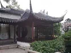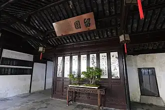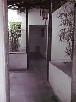 A complex and unique structure composed of a courtyard, open 3 bay hall, and covered corridor which functions as a single space. The courtyard is planted with two trees symbolizing jade (Magnolia soulangia) and gold (Osmanthus fragrans), a sign of prosperity. The entry to this space is marked by a tablet inscribed by Deputy Prime Minister Zhu Boqi which read, "Paradise on Earth".[2] |