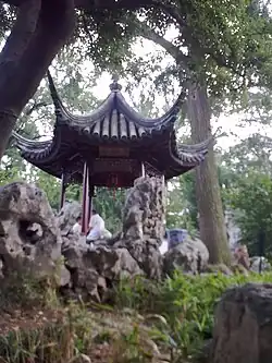 This five bay full gable structure was inspired by a verse from Li Bai, "There are five peaks to the south of Mount Lu which seem to be the golden lotus flowers cut out by nature". The selection of this verse was in turn was inspired by the preexisting Ming dynasty grotto which faces the front of the hall.[2] On the backside of the Hall a courtyard houses one of the 12 famous scholar stones, Rhesus Monkey Peak, of Liu Su's collection. Inside are numerous pillar couplets. |