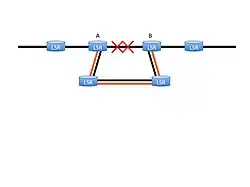 One form of fast re-route is called Link Protection.[6] In this protection, an LSP tunnel is set up through the network to provide a backup for a vulnerable physical link. The LSP provides a parallel virtual link. When the physical link fails, the upstream node switches traffic to the virtual link so that data continues to flow with a minimal disruption.