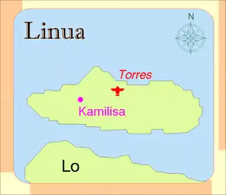 Linua has a length of 2.8 km and diameter of 1 km.[3] The estimated terrain elevation above sea level is 23 meters.[4] Linua lies about 60 miles (100 km) north of Espiritu Santo Island between islands of Tegua and Lo. The island is surrounded by coral reefs. There is an airstrip on the island[5] opened in 1983 that provides the only regular transportation flights with the rest of Vanuatu.