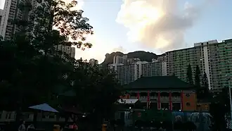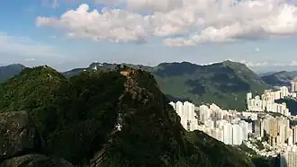 Lion Rock, or less formally Lion Rock Hill, is a mountain in Hong Kong. It is located in Sha Tin District,[1] between Kowloon Tong of Kowloon and Tai Wai of the New Territories, and is 495 metres (1,624 ft) high.[2] The peak consists of granite covered sparsely by shrubs. The Kowloon granite, which includes Lion Rock, is estimated to be around 140 million years old.[3]