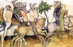 Sir Lionel is the subject of the late-medieval folk ballad "Sir Lionel", recorded as Child Ballad 18 and Roud No. 29, in which he slays a giant wild boar.[4] This song has much in common with a medieval tale about a knight who slays a terrifyingly fiendish boar in Sidon, in the fourteenth century romance of Sir Eglamour of Artois.[5] The terrible swine is a frequent foe in romantic tales, for instance the beast Twrch Trwyth in Culhwch and Olwen.[6]