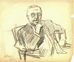 Lionello Perera was passionate about fine arts and acted as an important collector in the USA with a particular attention to eighteenth century genre painting, as well as nineteenth century European Naturalism.[8] His collection mostly consisted of Italian masters such as Pietro Longhi, Lorenzo Lotto, Arturo Noci, and Cosimo Rosselli.[19] Lionello Perera used to draw caricatures of friends, acquaintances and people he met during his public and private life.[14] He drew on everything that was at hand: envelopes, calendar pages, concert programs, business cards, and napkins. Among his subjects were several protagonists of American high society, politics, and the arts such as: Fiorello La Guardia, Enrico Caruso, Arturo Toscanini, and E. Philips Oppenheim. Hundreds of drawings are still in the collection of the Perera family and some even at the Library of Congress, though many are dispersed since he enjoyed exchanging caricatures as was customary at the time.[3]