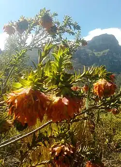The flowers resemble those of Protea, as they have adapted to the same pollinator, the sunbird.