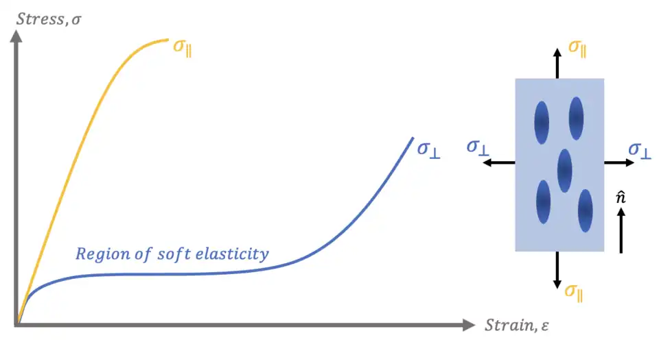Because of their anisotropy, the mechanical response of aligned nematic LCEs varies depending upon the direction of applied stress. When stress is applied along the direction of alignment (parallel to the director, ), the strain responds in a linear fashion, with a slope dictated by the material’s Young’s modulus. This linear stress-strain behavior continues until the material reaches its yield stress, at which point it may neck or strain harden before eventually failing. The shape of the stress-strain curve for LCEs stretched parallel to their aligned direction matches that of most classical rubbers and can be described using treatments such as rubber elasticity.