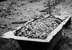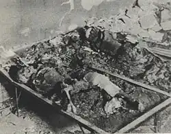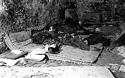 Lightly wounded patients and surviving staff were usually forced to leave the Old Town along with the civilian population. Few managed to survive. Even during the evacuation, SS officers conducted "selections", attempting to identify insurgents hiding among the crowd. Suspected individuals were often executed on the spot. The largest executions occurred in the so-called inter-wall area (Wąski Dunaj Street), where between 70[10] and 100 people,[11] mainly wounded insurgents, were shot. Their bodies were burned, and when Warsaw residents returned to the Old Town in January 1945, they discovered a bathtub filled with human ashes on Wąski Dunaj Street.[12] About 55 people were also executed on Castle Square,[13] and several dozen Jews liberated by the insurgents from the Warsaw concentration camp were murdered on Krasiński Square.[14][15]