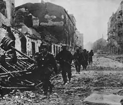On 2 September, in the early morning hours, the units of the Reinefarth Combat Group (including troops from the notorious SS-Sonderregiment Dirlewanger, who had previously gained infamy for the massacre in Warsaw's Wola district) cautiously entered the areas of the Old Town abandoned by the insurgents.[2] At 6:00 AM, German planes dropped leaflets in Polish calling on the civilian population to leave the Old Town within two hours, warning that the district would be razed to the ground after the deadline.[2] The advancing Germans engaged in skirmishes in several places with the last insurgent rearguards, made up mainly of soldiers from the Home Army battalions Wigry and Czata 49. As a result, German Junkers Ju 87 planes carried out several air raids on the Old Town quarters that had been abandoned by the insurgents but had not yet been occupied by the Germans.[2]