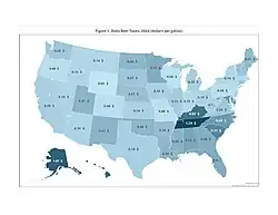 In the US, individual states impose excise and sales taxes on alcohol. Figure 1 shows the variation in 2024 for excises on beer among the 50 US states and District of Columbia. Excise rates vary from $0.02 per gallon in Wyoming to $1.29 per gallon in Tennessee, with a median rate of $0.26 per gallon.[28] Taxes are the single most costly ingredient in beer.