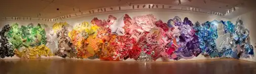 In a series of subsequent installations Hoke explored color chromatics and surface sensations to a greater degree, using colored paper and beverage cups as her materials. Light My Fire (Aldrich Museum, 2001; Rice University, 2006) consisted of short, variously cropped red, pink, yellow and white paper scrolls adhered to five adjacent windows; it exploited shifting sunlight to create a lace-like effect dappling the space with spots of light and color that changed (and faded in intensity) over time.[6][21] For the mural-like Gravity of Color (Elizabeth Harris, 2004), Hoke employed protruding paper cups and plastic beakers partially filled with paint to create jewel-like, serpentine forms of rich color that critics related to the encrusted walls of Gaudi and the swirling patterns of Seurat and Klimt paintings.[13][46] Hoke reworked the piece at the Katonah Museum of Art (2005)[47] and in a two-story, six-year installation at the New Britain Museum (2008).[46][4]