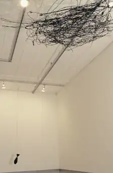 The sculpture Manifold Destiny (1991) was a notable example—a hanging assemblage of yellow and pink plastic patio furniture stripping increasingly entangled in rusted car mufflers and snaking exhaust pipes that suggested entropy.[11] Tema Celeste described it as a funny and frightening "Medusa in curlers … at once vulnerable and threatening, delicate and Herculean."[8] In shows at the Corcoran Gallery of Art (1992), Horodner Romley (1993, 1994) and Serpentine Gallery (London, 1998), domestic materials—thread, buttons, zippers, totems of colorful, stiff shirt sleeves, and shower curtains—predominated in works that employed an abstract sensibility and more airy, intuitive forms of weaving.[40][10][41][7][42] Heirloom (1994) consisted of skeins of colored thread that were tossed, fixed and installed in vertical fans of dense, lacy patterning across two corner walls, then connected by single threads to cast wax detergent bottle and household forms on the floor.[7] Critics likened the 12-foot work's appearance to "a grandmother's unraveled afghan,"[41] sea corals or tangled hair and its calligraphic patterns and process to Abstract Expressionism, a debt referenced in the double meaning of its title.[7][10][43][39]