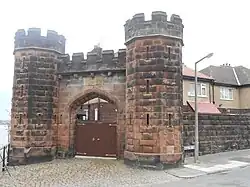 Liscard Battery was built in 1858 to help protect shipping on the River Mersey and defend the port of Liverpool. It was equipped with seven 10-inch guns. Set back from the river and hidden by new building, it was known as "the snake in the grass" to local inhabitants. The battery was obsolete by 1912, and sold on and houses were erected on top, and now the site has an odd appearance with only the curtain wall and ornate crenellated gatehouse surviving.[13] This gateway was designated a Grade II listed building in 1988.[14]
