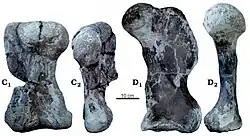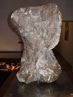Its backbone and ribs are typical for dicynodonts, however, the cervical vertebrae of the neck are notable for having unusual hollows excavated into their sides. This is similar to the holes in some dinosaur vertebrae that are associated with a system of air sacs and a bird-like respiratory system. However, unlike dinosaurs Lisowicia lacks openings in its vertebrae (pleurocoels) for air sacs and the interior of the vertebra is solid. This trait is unique to Lisowicia amongst dicynodonts, and its function is unclear. The bones of the pelvis and hind limb are very robust compared to other dicynodonts due to the massive size of the animal (e.g. the largest known femur is 80 centimetres (31 in) long), but are otherwise similar to those of other stahleckeriids. Like other stahleckeriids, the hind legs were also held upright beneath the body.[1]