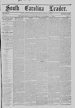 This is a list of African American newspapers that have been published in South Carolina. It includes both current and historical newspapers. More than 130 such newspapers were published in the state between 1865 and 1970.[1] The first was the South Carolina Leader, established at Charleston in 1865.[2] In the 19th and early 20th centuries, the growth of the African American press in South Carolina was hampered by the fact that a large proportion of South Carolina African Americans lived in poverty in the countryside.[1]