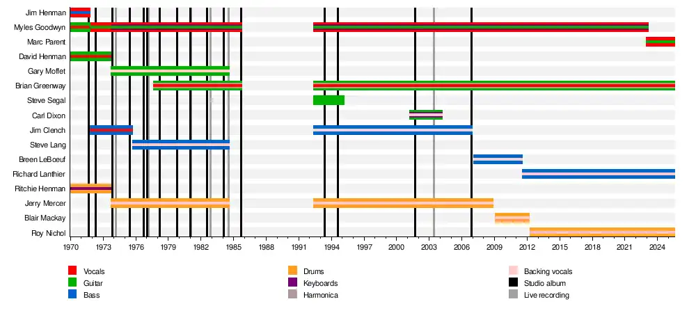 The lineup of Goodwyn, Moffet, Clench and Mercer released Live! in 1974 and Stand Back in 1975, before Clench left after disagreements with the rest of the band concerning "musical direction".[4] He was replaced by Steve Lang, who debuted on The Whole World's Goin' Crazy the next year.[6] Forever for Now and Live at the El Mocambo followed in 1977, before Brian Greenway of The Dudes (which featured David and Ritchie Henman) joined the band that August, making it a five-piece for the first time.[3] The new five-piece lineup remained stable for several years, releasing a string of successful albums, but eventually disbanded after Goodwyn and the rest of the band grew apart due to creative differences; they played a farewell tour which ended on July 31, 1984, and spawned the live album One for the Road.[3]
