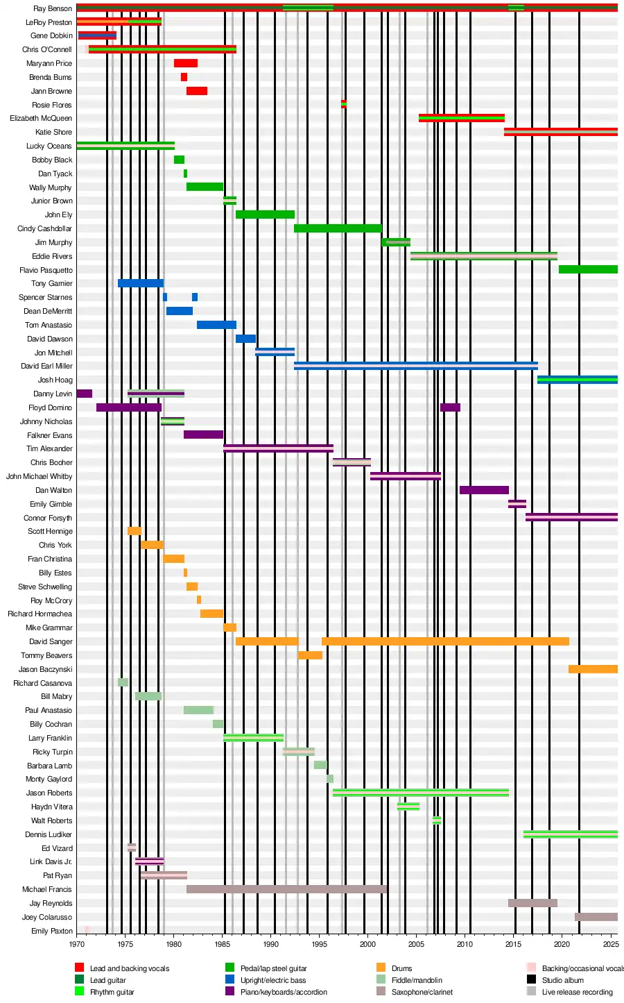 In late 2006, Walt Roberts joined on second fiddle,[53] although less than a year later he had left again.[54] Also in 2007, former pianist Floyd Domino returned to the band.[55] The group collaborated with Willie Nelson on Willie and the Wheel in 2009, and later in the year Dan Walton took over from Domino.[56] In January 2014, McQueen left to raise her children and was replaced by Katie Shore, who also played second fiddle.[57][58] Jason Roberts left a few months later, at which point Shore became the primary fiddler in the group.[59] Around the same time, pianist Emily Gimble (the granddaughter of fiddler Johnny Gimble) and saxophonist/clarinetist Jay Reynolds joined the band.[60]
