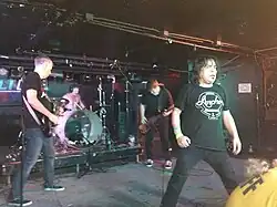 After Pettibon's exit from the group, a friend of Morris' known as "Kansas", real name Jim Dearmen, became their new bassist.[91] Described by Morris as "just this huge stoner", Kansas and drummer Bryan Migdol were not committed to the band and would often fail to show up for rehearsals.[3] This caused Ginn to modify his guitar style to a percussive strum that doubled as a lead and rhythm section.[4] Kansas left the band before the summer of 1977, and was replaced at rehearsals by Glenn "Spot" Lockett.[92]