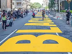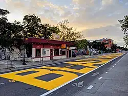 On June 5, 2020, during the George Floyd protests, the DC Public Works Department painted the words "Black Lives Matter" in 35-foot-tall (11 m) yellow capital letters on 16th Street NW on the north of Lafayette Square, part of President's Park near the White House, with the assistance of the MuralsDC program of the DC Department of Public Works, with the DC flag accompanying the text.[1][2][3] Multiple other cities across the United States, as well as in Canada and the United Kingdom, subsequently painted their own "Black Lives Matter" paintings on streets, typically if inaccurately called "murals", although they are not on walls..