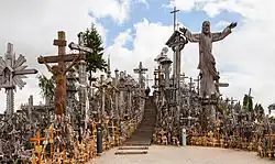 During the Soviet anti-religious campaign in 1958–1964, the authorities of the Lithuanian SSR took active measures to hinder the pilgrims and destroy several pilgrimage sites – chapels of Verkiai and Vepriai Calvaries were demolished while crosses were removed from the Hill of Crosses.[1] After the Lithuania regained independence in 1990, many sites were repaired or reconstructed or new chapels were built (e.g. Janoniai Chapel and Kvintiškės Chapel at the sites of Marian apparitions in 1962 and 1967). In 1993, during his visit to Lithuania, Pope John Paul II visited several key pilgrimage sites, including the Gate of Dawn, Hill of Crosses, and Šiluva.[1] In 2007, for the 15th anniversary of his visit, Lithuanian bishops and Lithuanian government established a pilgrim route of Pope John Paul II with 14 sites; two more sites were added in 2009. The route includes Šiauliai Cathedral and Christ's Resurrection Church, Kaunas due to their architectural and historical significance.[3] In 2013, several Municipalities of Lithuania established several routes inspired by Camino de Santiago (St. James Way) that connect different churches of St. James in different regions of Lithuania.[5]