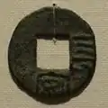 During the Warring states period, the first precursors of the Chinese cash coins started to appear. These early round coins (圜錢, huánqián) circulated alongside the knife and spade money. As most of these early round coins had round holes, the first "true" cash coins were the Yi Hua (一化) produced by the State of Yan.[4][5] Apart from two small and presumably late coins from the State of Qin, coins from the spade money area have a round hole and refer to the jin and liang units. Those from the knife money area have a square hole and are denominated in hua.[6]