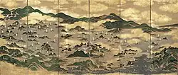 on silk, mounted on a pair of six-panel folding screens[27] 364.2 centimetres (11 ft 11.4 in) by 168.2 centimetres (5 ft 6.2 in) 39°17′32″N 140°32′51″E / 39.2923054°N 140.54753148°E / 39.2923054; 140.54753148 (Akita Museum of Modern Art)