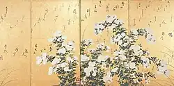 | Byōbu with Waka and Chrysanthemums 菊絵和歌屏風 kiku-e waka byōbu |