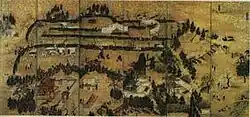 early C17 | Matsushima | Kanrantei | 21 panels, colours on gold ground; paper pasted on bamboo shōji (12), hinoki fusuma (6), and the hinoki walls of the tokonoma (3); the paintings include trees, rocks, waters, and spring flowers - dandelions, daffodils, azaleas, violets, and crab apples; attributed on stylistic grounds to Kanō Sakyō (狩野左京), a painter of the Kanō School in the employ of the Sendai Domain[5] | 38°22′10″N 141°03′41″E / 38.369437°N 141.061342°E | [1] | ||