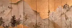| Spring and Summer Landscapes, colour on gold ground, byōbu attributed to Unkoku Tōgan 金地著色春夏山水図〈(伝雲谷等顔筆)/六曲屏風〉 kinji chakushoku shunka sansui zu (den-Unkoku Tōgan hitsu rokkyoku byōbu) |