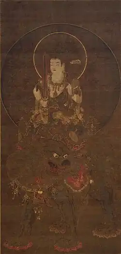 | Monju Bosatsu Riding a Lion, colour on silk 絹本著色騎獅文殊菩薩像 kenpon chakushoku kishi Monju bosatsu zō |