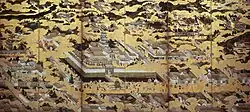 | Scenes in and around the Capital, colours on paper with gold ground 紙本金地著色洛中洛外図〈/六曲屏風〉 shihon kinji chakushoku rakuchū rakugai zu (rokkyoku byōbu) |