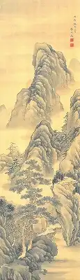| Landscape, light colours on silk, by Yo Shakuya 絹本淡彩山水図 余夙夜筆 kenpon tansai sansui zu Yo Shakuya hitsu |