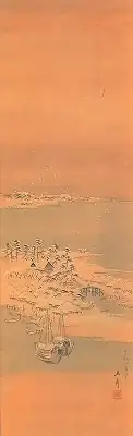 | Tsukuda-jima Sumiyoshi in Tōkyō Arashiyama in Kyōto Beach by the Light of the Rising Moon at Naniwa Sumiyoshi light colours on silk, by Andō Hiroshige 絹本淡彩 東都佃島住よし図 京都嵐山図 浪花住吉月出見の浜図 安藤広重筆 kenpon tansai Tō-to Tsukuda-jima Sumiyoshi zu Kyōto Arashiyama zu Naniwa Sumiyoshi tsuki de mi no hama zu (Andō Hiroshige hitsu) |