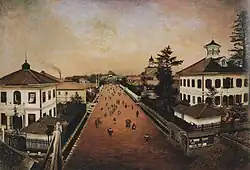 in 1881 and 1884 Takahashi Yuichi was commissioned by Mishima Michitsune to paint scenes of public works in Yamagata Prefecture; in the centre is the Yamagata Prefecture Office of 1877, on the right a school and the police headquarters, and on the left a museum[17] | ![]() |