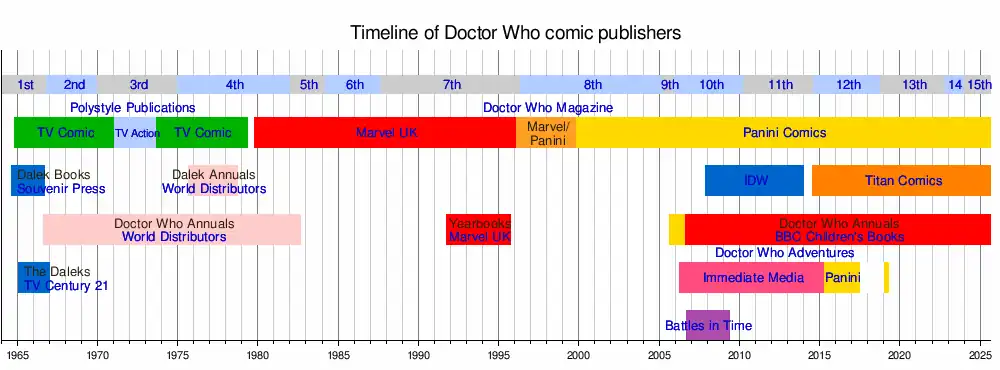 First launched in the pages of TV Comic in November 1964, the comic strip version of Doctor Who is just one year younger than the television series on which it is based. The strip appeared almost every week: first in TV Comic, then in Countdown and TV Action before returning to TV Comic. All these titles were produced by a company called Polystyle Publications (formerly TV Publications), which held the rights to publish a Doctor Who comic [strip] until May 1979 when the last installment of the strip appeared.[1]