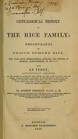- ^ Ward, Andrew Henshaw. 1858. A genealogical History of the Rice Family: Descendants of Deacon Edmund Rice, Boston: C. Benjamin Richardson, Publisher. 379pp. Download PDF
