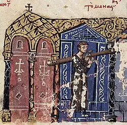 Not counting the ancient Greek harps, earliest depictions of harps in Europe include examples in Scotland (the Nigg Stone, late 8th century) and Ireland (early images in stone carvings appear to show oblong, c-shaped and triangular harps or lyres.[56]). Other early works can be seen from France, such as the ivory cover to the Dagulf Psalter in France and the 9th century illustrations in the Utrecht Psalter. Harps were strung throughout Europe with gut strings. Exceptions include Ireland (where strings were of metal) and Wales (where portable harps used horsehair strings through the 17th century A.D.).[57] For comparison of harps from across the ancient and medieval world, look at angular harps, arched harps, and konghou. |