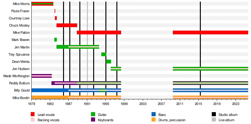 The band, consisting of Mike Morris, Billy Gould, Wade Worthington, and Mike Bordin, first formed in 1979 under the name Faith No Man, recording just one release. Wade left shortly afterward and was replaced by Roddy Bottum. In 1982 the band, minus Mike Morris, quit to form Faith No More. During this time they went through the majority of their long list of vocalists and guitarists, Courtney Love being the third and longest-standing vocalist at the time.[1] They then settled on Chuck Mosley and Jim Martin, with whom they recorded and released their first two studio albums, We Care a Lot and Introduce Yourself. After the tour for Introduce Yourself the band fired Mosley and hired Mike Patton from the experimental band Mr. Bungle. This was Faith No More's longest-standing lineup and featured the most releases, including the studio albums The Real Thing and Angel Dust. Following the departure of Jim Martin in late 1993 the band went without a guitarist until starting the writing of the follow-up to Angel Dust, King for a Day... Fool for a Lifetime, for which they hired Trey Spruance, also of Mr. Bungle. Spruance left before the tour and was replaced by Dean Menta. Menta was then replaced by Jon Hudson before the recording of the band's final album, Album of the Year. Faith No More split up in 1998.[2]