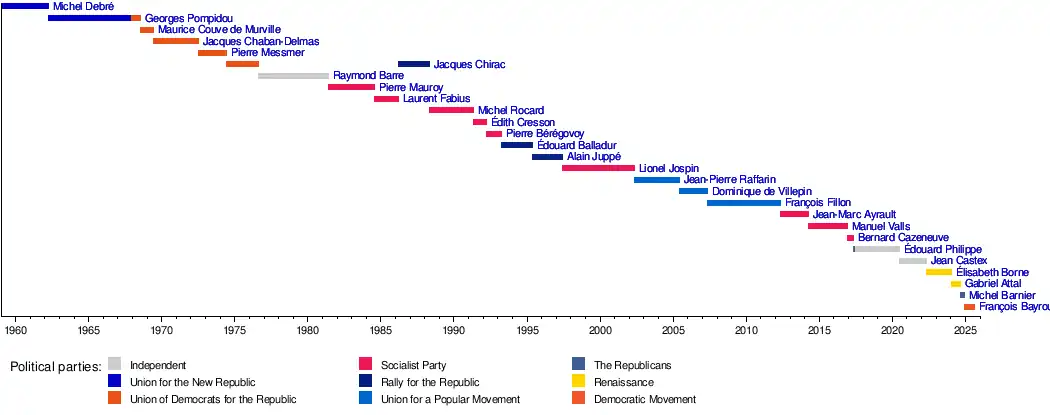 17 May 1995 | 7 November 1995 | 2 years, 16 days | Rally for the Republic | Juppé I | 22 | Jacques Chirac![]() (1995–2007) | ||