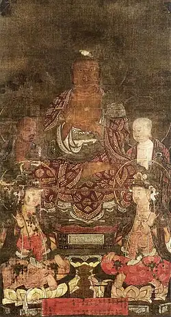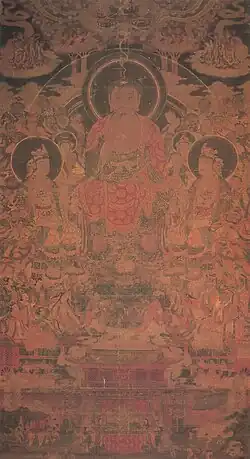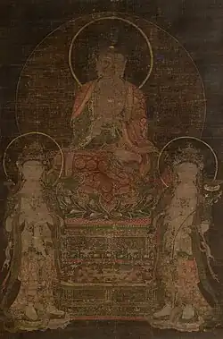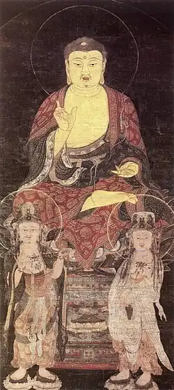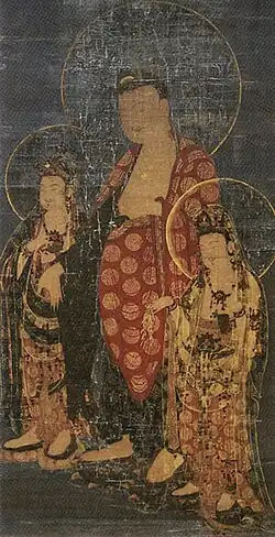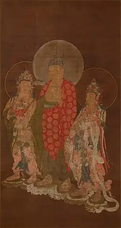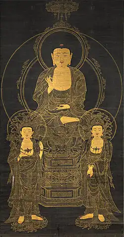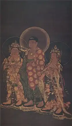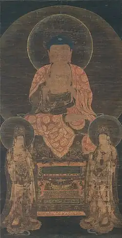 - ^ a b c 絹本著色阿弥陀三尊像 [Amida Triad, colour on silk] (in Japanese). Agency for Cultural Affairs. Retrieved 26 October 2013.