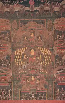 | Visualization of the Hwaom Pure Land | C13 | five main buddhas are at the bottom, fifty-two bodhisattvas descend on clouds; ink, colour, and gold on silk; sold at Christie's in 2003 | ![]() |