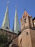 | Freiberg | St. Nikolai | 1185–1190 | upper storeys of the steeples | ![]() |