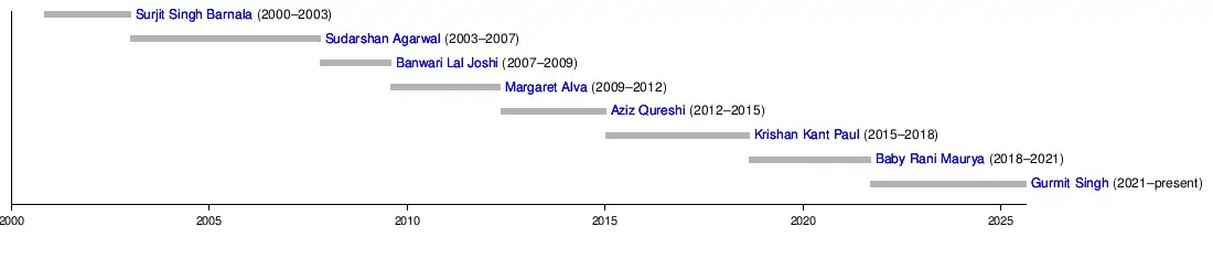 Uttarakhand was created on 9 November 2000, when it was carved out from the Himalayan districts of Uttar Pradesh. The first governor of the state was Surjit Singh Barnala who served in office between 2000 and 2003. The current governor is Lieutenant General Gurmit Singh (Retd.) who has been in office since 14 September 2021. As of date, eight individuals have served as the governor of the state including two women - Margaret Alva and Baby Rani Maurya. No governor has till date completed full term in office. Sudarshan Agarwal holds the record of the longest-serving governor with 4 years, 293 days in office.