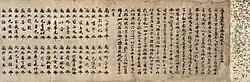 694 | one scroll with thirty-nine pages of hemp fibre paper, each with fifty-six ruled lines, each with thirty-two characters; brushwork by Li Yuanhui (李元恵); the scroll has a jasper-inlaid axis and a hollowed-out sandalwood case; said to have belonged to Shōtoku Taishi | 15.7 centimetres (6.2 in) by 2,150 centimetres (850 in) | N-7 | [11] [12] | |