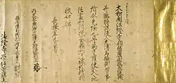 1190s | two wrappers with gold brocade edges; according to an inscription on the back, they were donated by Minamoto no Yoritomo in the Kenkyū era and repaired in December 1707 | 31.7 centimetres (12.5 in) by 42.0 centimetres (16.5 in) | N-9 | [15] [16] | |