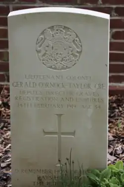 | Lieutenant Colonel Gerald Cornock-Taylor CBE | 14 February 1919 | Fillievres British Cemetery | Died age 34. Deputy Director of Graves Registration and Enquiries and Secretary to the Imperial War Graves Commission from 13 December 1917 until his death in 1919. | ![]() |