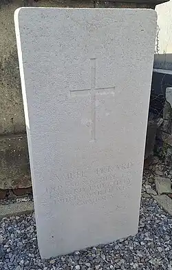 | Sidney Albert "Bert" Witton | 18 August 1945 | From Canning Town, London; served with the RAF in the First World War; husband of decorated Comet Line guide Rosine Witton. Bert Witton was interned by the Germans at Ilag VIII Tost and Giromagny. He was repatriated to the UK in March 1945 and went directly into hospital, where he died in August 1945. His body was repatriated to Arras to be buried in his wife's family plot.[10] | ![]() | |